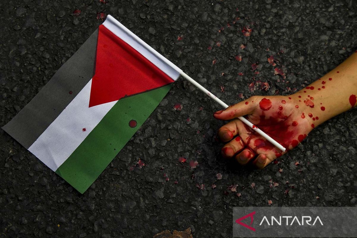 Pengunjuk rasa yang tergabung dalam Aksi Solidaritas Untuk Palestina melakukan aksi teatrikal di Jakarta, Jumat (20/10/2023). Dalam unjuk rasa tersebut mereka mendesak para pimpinan Negara Arab dan Dunia untuk bersatu dan mendesak Israel segera menghentikan kekejaman terhadap warga Palestina. BERITA CALEG FOTO/Muhammad Adimaja/aww.