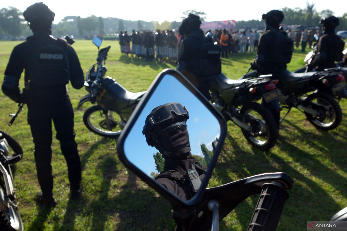 Anggota Brimob mengikuti apel gelar pasukan Operasi Lilin Agung 2023 di Lapangan Puputan Margarana, Denpasar, Bali, Kamis (21/12/2023). Operasi Lilin Agung yang digelar di wilayah Bali tersebut melibatkan 4.020 personel gabungan dari Polri, TNI, pemda, dan instansi terkait lainnya untuk pengamanan kegiatan di berbagai lokasi menjelang Natal 2023 dan Tahun Baru 2024. BERITA CALEG FOTO/Nyoman Hendra Wibowo/aww.