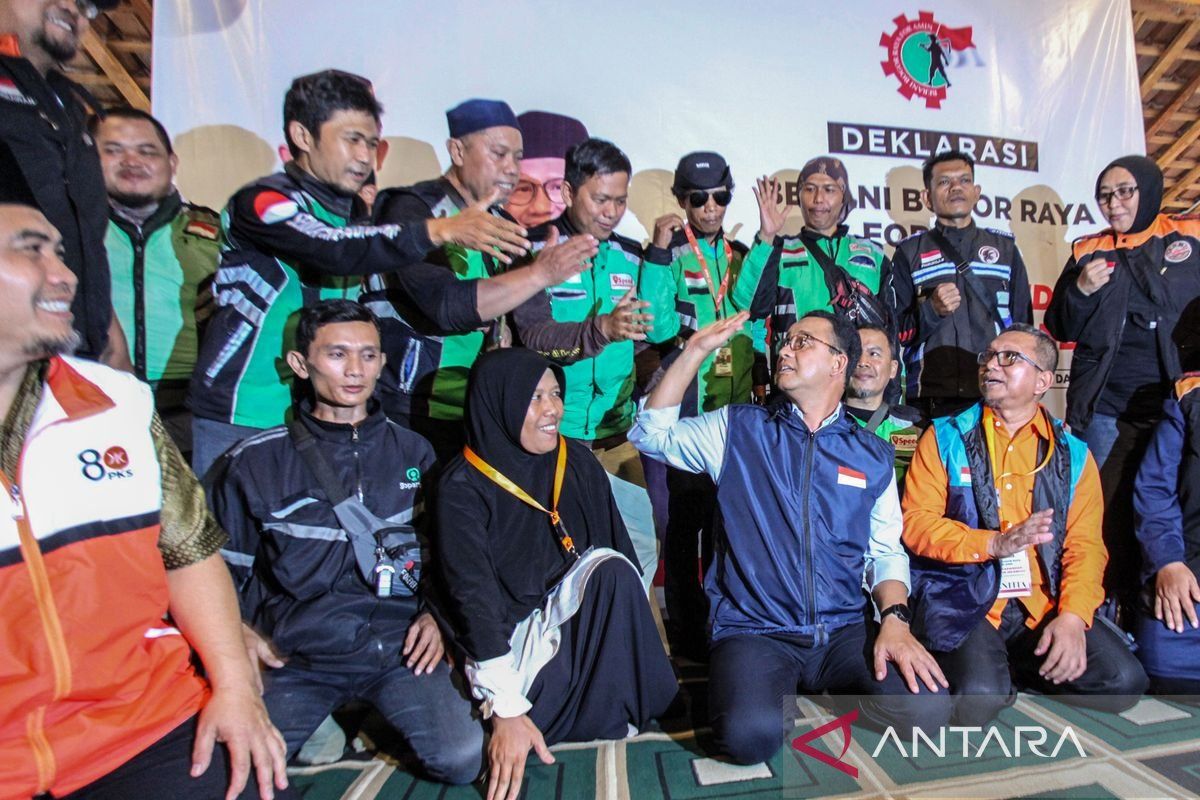 Bakal calon presiden Anies Baswedan (kedua kanan bawah) menyapa relawan Barisan Elemen Buruh, Aktivis Lingkungan dan Petani (Berani) Bogor Raya saat deklarasi di Nanggewer, Kabupaten Bogor, Jawa Barat, Jumat (27/10/2023). Deklarasi relawan Berani tersebut untuk mendukung pemenangan Anies Baswedan dan Muhaimin Iskandar pada Pilpres 2024. BERITA CALEG FOTO/Yulius Satria Wijaya/tom.