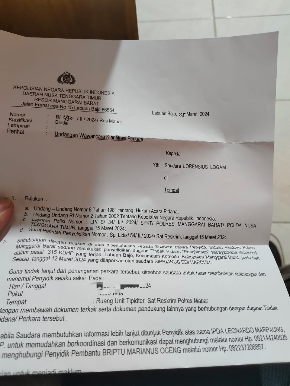 Terpantau, Lorens Logam sedang berada di kantor Polisi Resort Manggarai Barat pada pukul 09.00 Wita guna memberi keterangan.