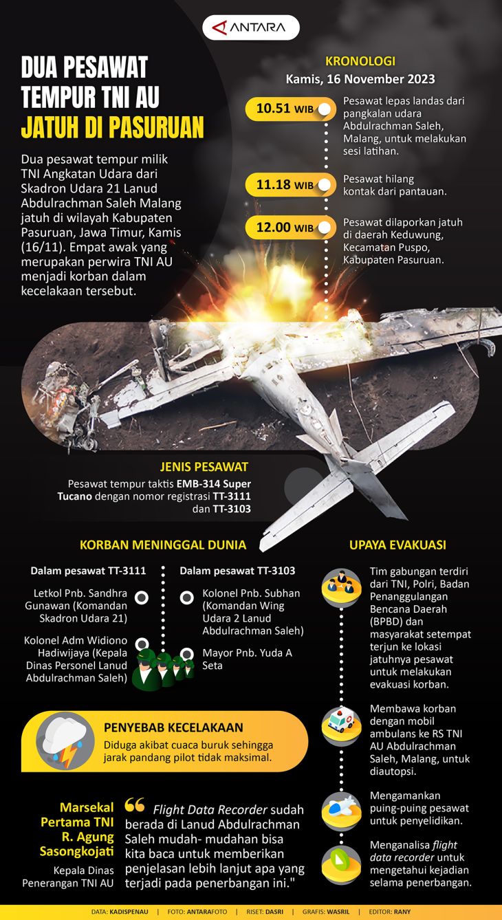 Dua pesawat tempur milik Skadron Udara 21 Lanud Abdulrachman Saleh TNI Angkatan Udara (AU) jatuh di wilayah Kabupaten Pasuruan, Jawa Timur, Kamis (16/11). Empat awak yang merupakan perwira TNI AU menjadi korban dalam kecelakaan tersebut.
