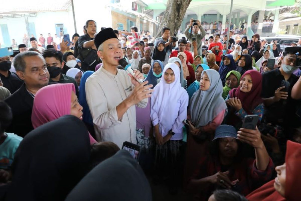 Bakal calon presiden (bacapres) Ganjar Pranowo membahas pengembangan pendidikan untuk pondok pesantren (ponpes), saat mengunjungi Ponpes Al-Jauhariyah Balerante, Cirebon, Jawa Barat, Minggu.