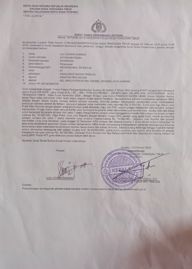 Keterangan dari ibu rumah tangga, Lili Lidwina Sonbay saat ditemui media dikediaman rumahnya, Sabtu Sore (8/2/25) ia menjelaskan bahwa, telah ditipu oleh dua orang laki-laki yang berinisial R dan M dengan adanya proyek Makan Bergizi Gratis (MBG) nanti.