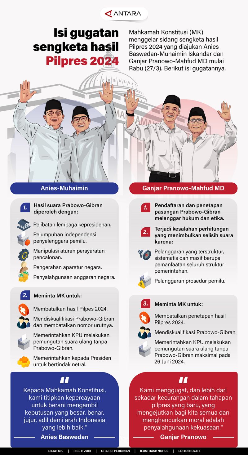 Mahkamah Konstitusi (MK) menggelar sidang sengketa hasil Pilpres 2024 yang diajukan Anies Baswedan-Muhaimin Iskandar dan Ganjar Pranowo-Mahfud MD mulai Rabu (27/3). Berikut isi gugatannya.