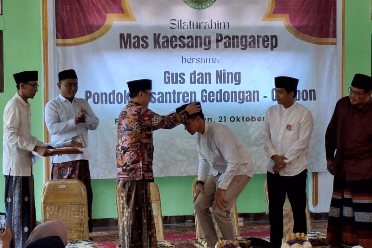 Ketua Umum Partai Solidaritas Indonesia (PSI) Kaesang Pangarep diangkat sebagai santri kehormatan oleh pengurus Pondok Pesantren Gedongan, Cirebon, saat mengadakan safari politik di salah satu pesantren tertua di Cirebon tersebut pada Sabtu pagi.