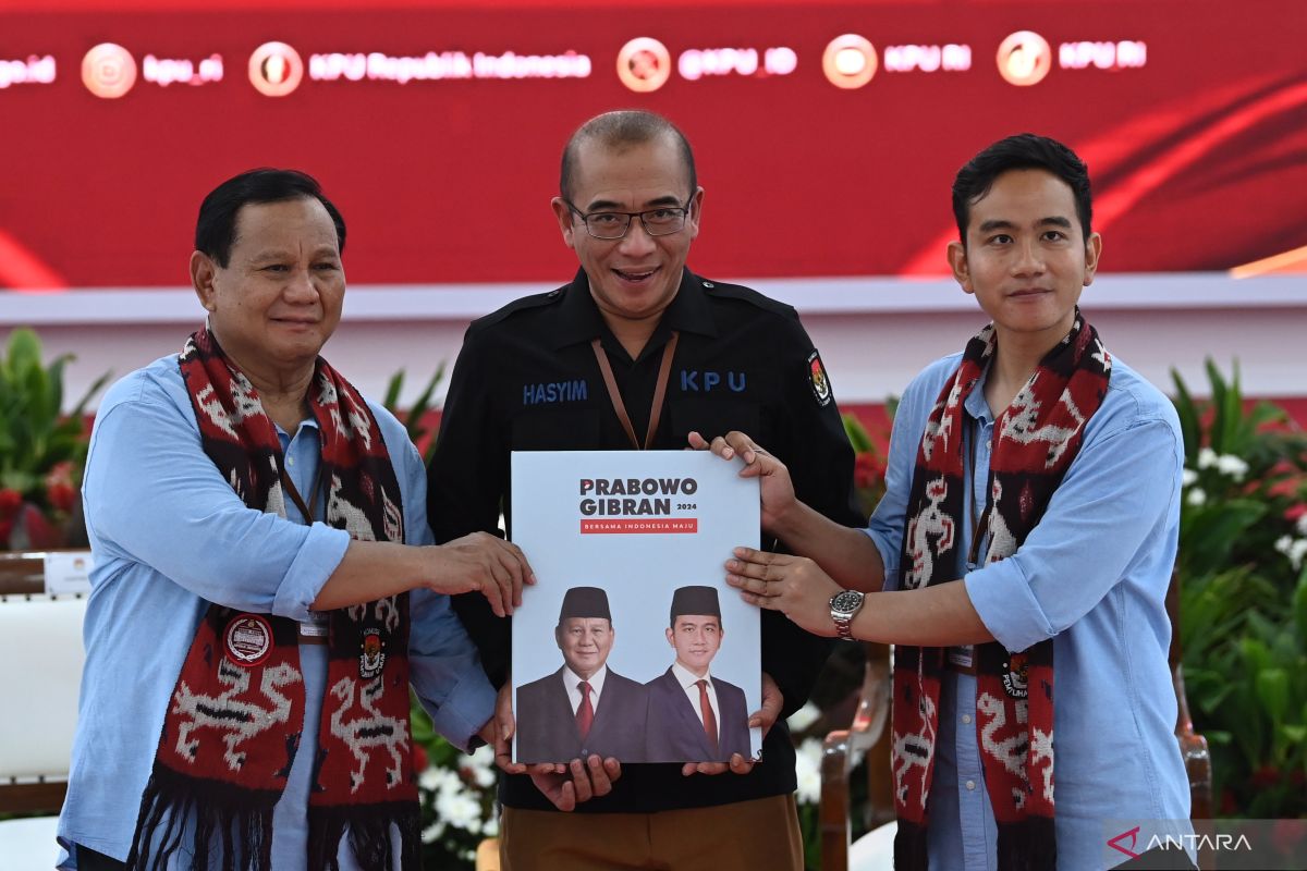 Bakal pasangan capres dan cawapres usungan Koalisi Indonesia Maju (KIM), Prabowo Subianto-Gibran Rakabuming Raka, tiba di Kantor KPU RI, Jakarta, Rabu, pukul 11.20 WIB.