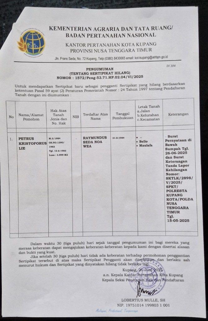 a.n. Kepala Kantor Pertanahan Kota Kupang