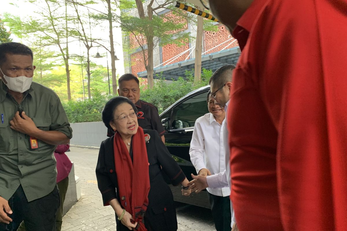 Presiden ke-5 RI Megawati Soekarnoputri tiba di Gedung High End, Kebon Sirih, Jakarta Pusat, sekitar pukul 14.15 WIB, dan disambut Ketua Umum Partai Perindo Hary Tanoesoedibjo dan Sekretaris Jenderal PDI Perjuangan Hasto Kristiyanto.