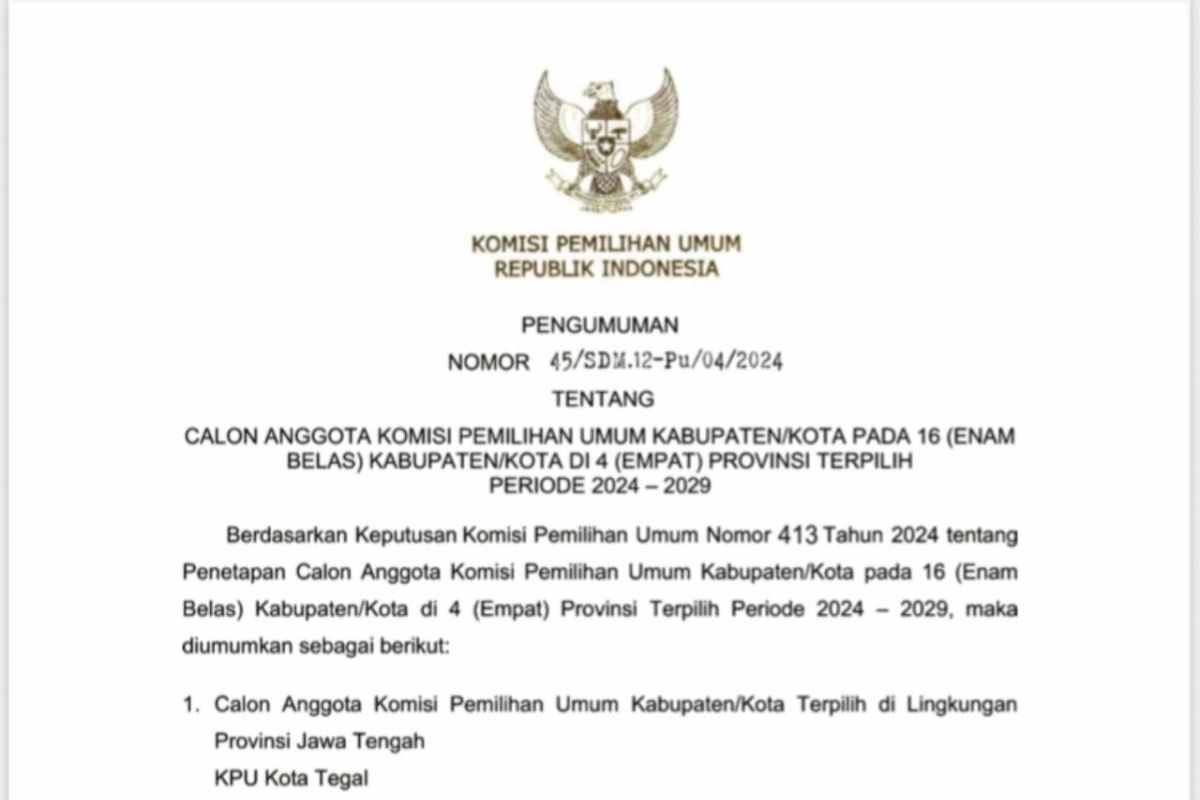 Pengumuman KPU RI berdasarkan Nomor 45/SDM/12-Pu/04/2024 tentang Calon Anggota KPU kabupaten/kota pada 16 kabupaten/kota di 4 provinsi terpilih periode 2024-2029, yang ditandatangani Ketua KPU RI, Hasyim Asy’ari tetanggal 25 Maret 2024.