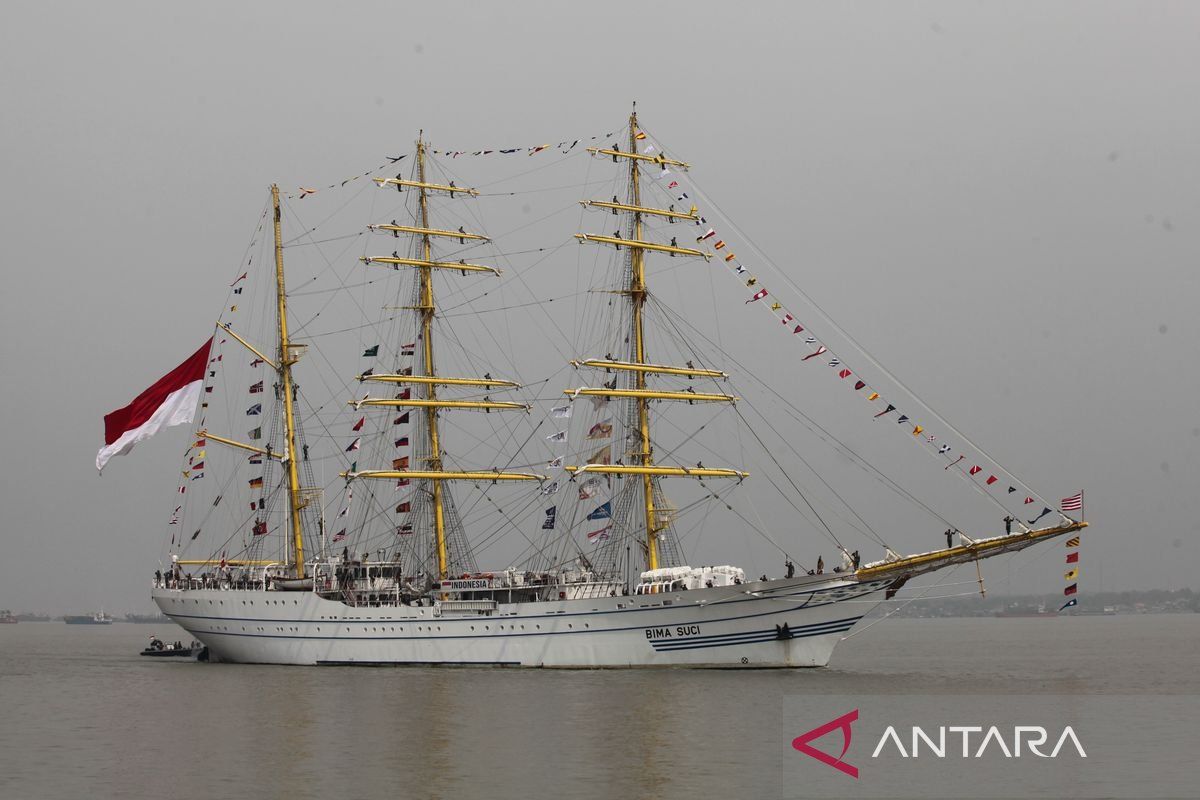 KRI Bima Suci bersiap untuk bersandar di Dermaga Madura, Koarmada II, Surabaya, Jawa Timur, Rabu (1/11/2023). Kapal latih TNI Angkatan Laut itu kembali ke tanah air setelah melaksanakan misi diplomasi dan muhibah duta bangsa dalam rangka mendukung Latihan Praktek (Lattek) Pelayaran Kartika Jala Krida (KJK) Taruna Akademi Angkatan Laut (AAL) Angkatan ke-70 tahun 2023 selama tujuh bulan ke sejumlah negara. BERITA CALEG FOTO/Didik Suhartono/tom.