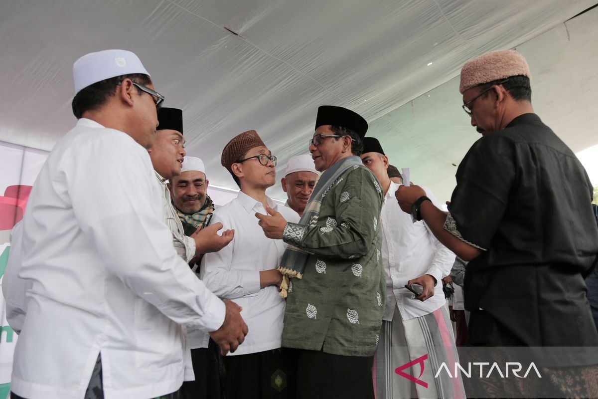 Cawapres nomor urut tiga Mahfud MD (tengah) berbincang dengan sejumlah tokoh dan ulama saat berkunjung ke Morkepek, Bangkalan, Jawa Timur, Sabtu (18/11/2023). Kunjungan Mahfud MD tersebut dalam rangka menyapa masyarakat sekaligus bersilaturahmi dengan sejumlah tokoh dan ulama di Madura. BERITA CALEG FOTO/Moch Asim/tom.