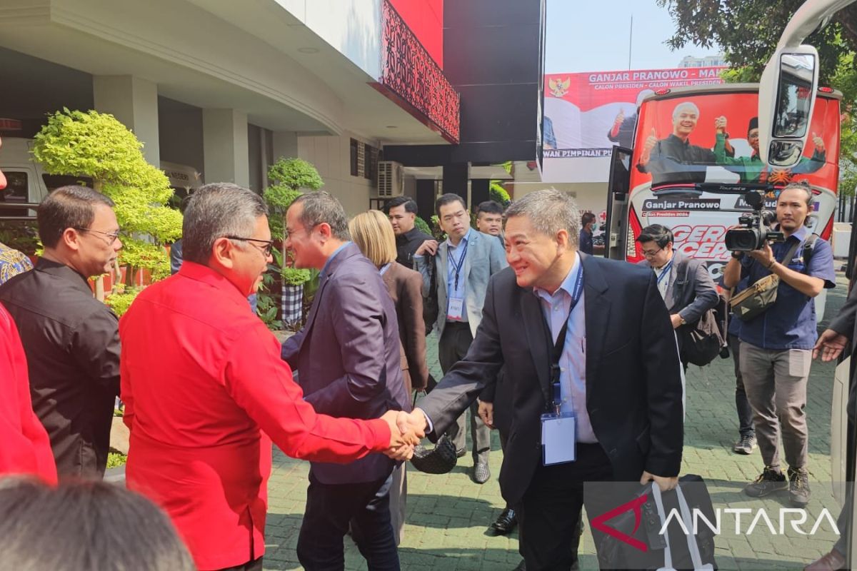 Hasto bersama Ketua DPP PDI Perjuangan Ahmad Basarah dan Wakil Sekretaris Jenderal Sadarestuwati menyambut delegasi dari sembilan negara pengurus partai politik.