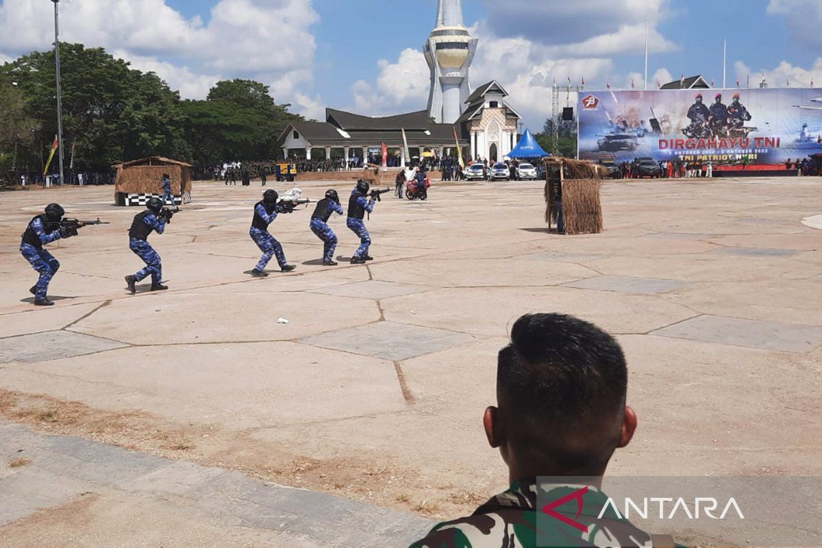 Kendari (BERITA CALEG) – Rangkaian peringatan Hari Ulang Tahun (HUT) ke-78 Tentara Nasional Indonesia 2023 di Kendari, Sulawesi Tenggara, Kamis, ditandai dengan simulasi pembebasan sandera tawanan teroris dari personil TNI AL, TNI AD, dan TNI AU.