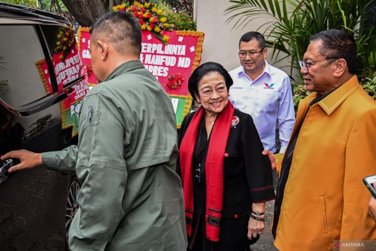 Ketua Umum PDIP Megawati Soekarnoputri (kedua kiri) berjalan memasuki mobil didampingi Ketua Partai Persatuan Indonesia Hary Tanoesoedibjo (kedua kanan) dan Ketua Umum Partai Hanura Oesman Sapta (kanan) usai mengikuti pertemuan koalisi pengusung Ganjar-Mahfud di Kebon Sirih, Jakarta, Rabu (25/10/2023). Pertemuan tersebut untuk membahas strategi pemenangan pasangan Ganjar-Mahfud MD pada Pemilu 2024. BERITA CALEG FOTO/Sulthony Hasanuddin/foc.