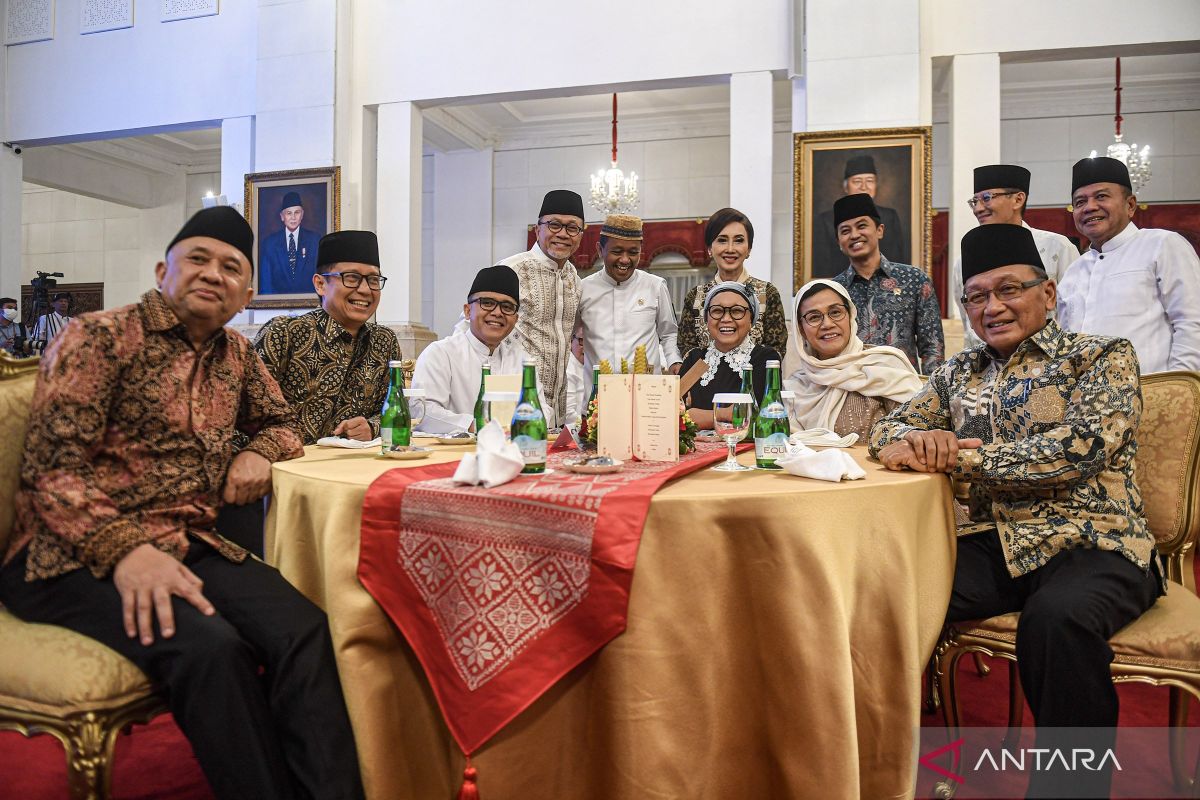 Sejumlah menteri Kabinet Indonesia Maju dan anggota Wantimpres berfoto bersama saat menghadiri acara buka puasa bersama Presiden Joko Widodo dan Wakil Presiden Ma’ruf Amin di Istana Negara, Jakarta, Kamis (28/3/2024). Presiden Joko Widodo menggelar silaturahim dan buka puasa bersama dengan para pimpinan lembaga negara, Menteri Kabinet Indonesia Maju serta perwira tinggi TNI dan Polri. BERITA CALEG FOTO/Muhammad Adimaja/aww.
