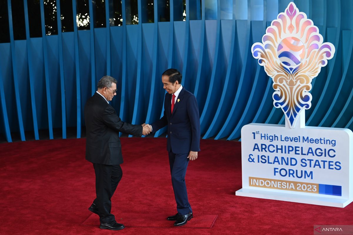 Presiden Joko Widodo (kanan) berjabat tangan dengan Perdana Menteri Tuvalu Kausea Natano setibanya di lokasi KTT AIS Forum 2023 di Nusa Dua, Badung, Bali, Rabu (11/10/2023). BERITA CALEG FOTO/Media Center KTT AIS Forum 2023/Aditya …