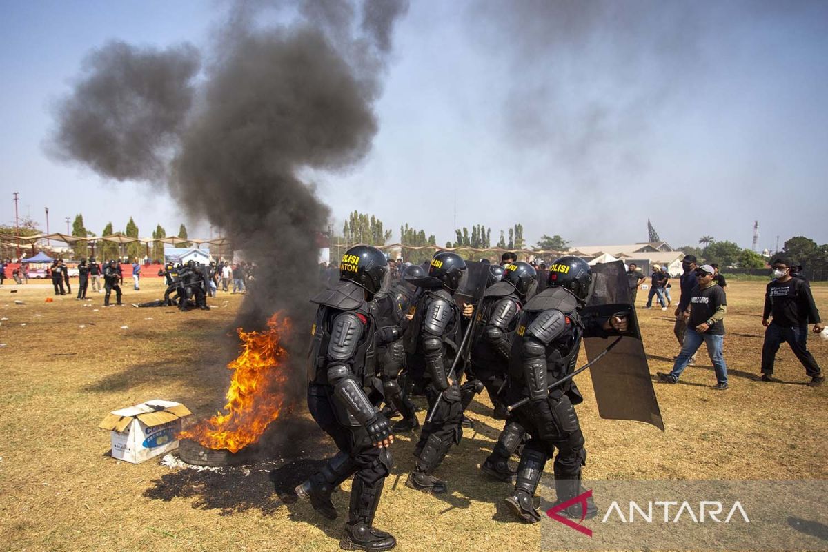 Personel Brimob Polda Jabar berupaya membubarkan unjuk rasa saat simulasi gabungan pengamanan Pilkada di Indramayu, Jawa Barat, Senin (16/10/2023). Simulasi Sistem Pengamanan Kota (Sispamkota) yang diikuti 800 personel gabungan itu untuk meningkatkan kesiapan petugas yang terlibat dalam Operasi Mantap Brata 2023-2024 dalam menangani gangguan keamanan selama pelaksanaan tahapan Pemilu. BERITA CALEG FOTO/Dedhez Anggara/aww.