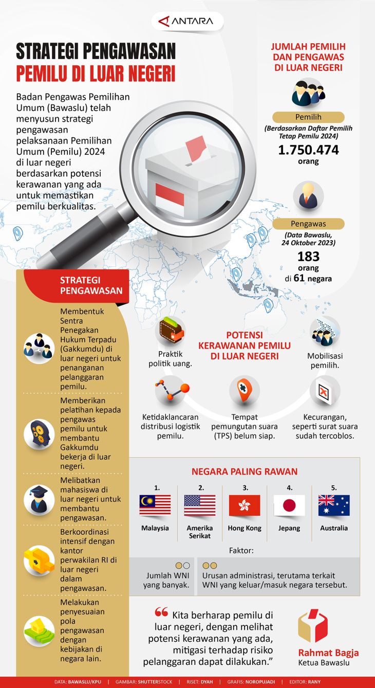Badan Pengawas Pemilihan Umum (Bawaslu) telah menyusun strategi pengawasan pelaksanaan Pemilihan Umum (Pemilu)2024 di luar negeri berdasarkan potensi kerawanan yang ada untuk memastikan pemilu berkualitas.