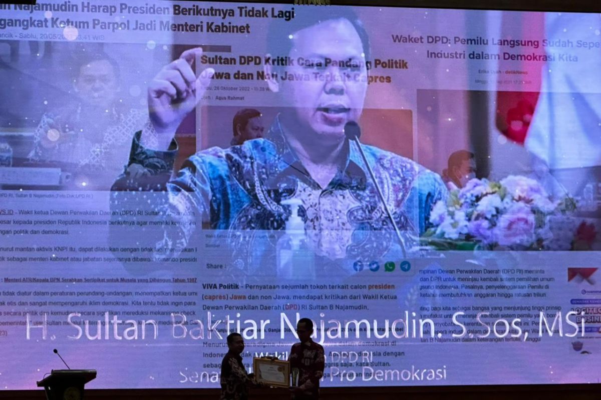 “Dewan Perwakilan Daerah (DPD) RI secara kelembagaan selalu konsisten menjaga nilai-nilai demokrasi Pancasila,” kata Sultan dalam sambutannya usai menerima penghargaan.