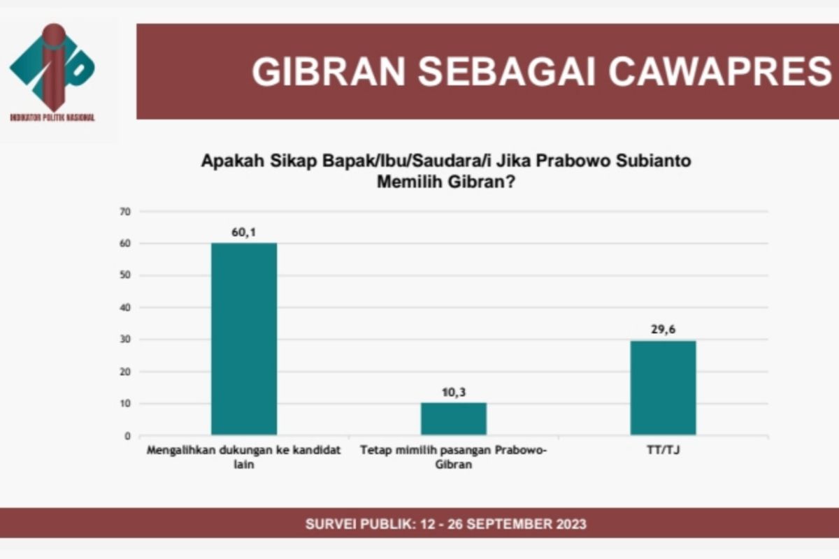 “Responden yang tetap memilih Prabowo Subianto dan Gibran hanya tersisa 10,3 persen responden dan yang memilih tidak menjawab atau tidak tahu sebanyak 29,6 persen,” ungkapnya.