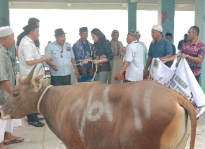 Wakil Wali Kota Kupang, Serena Francis, menyerahkan hewan Qurban untuk Masjid Nurul Hidayah Kelapa Lima, Kota Kupang, Kamis sore (5/6/25).